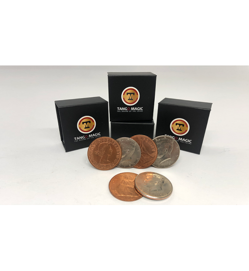 Two coins are shown in the palm of your left hand: one English penny and one half dollar. You place the English penny in your pocket, yet, when you open your hands, both coins will be in your palm again. Then you place the half dollar coin in your pocket and again the coin returns to your hand. Again you place the half dollar coin in your pocket and again the coin returns to your hand. Finally you place the English penny in your pocket, open your hand and there is no coin. The last coin has disappeared!