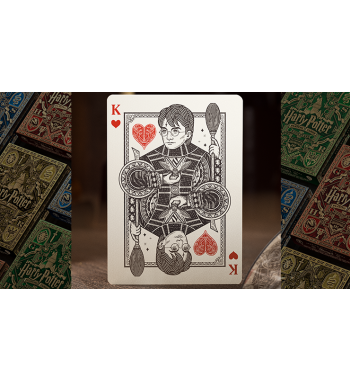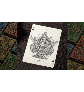 Las cartas de juego de Harry Potter presentan ilustraciones completamente personalizadas en cada aspecto del diseño, con los ases, los comodines, el diseño de la caja y las cartas de la corte inspirados directamente en los personajes y eventos favoritos de los fanáticos en el Mundo Mágico.
