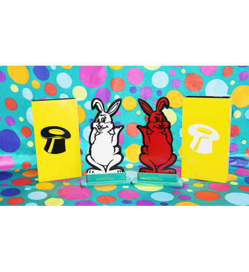 Perfecto para espectáculos infantiles. ¡Mucha risa! Haz que un conejo recortable negro y uno blanco intercambien milagrosamente sus lugares dentro de sus cajas. El intercambio puede repetirse varias veces para provocar risas a carcajadas.